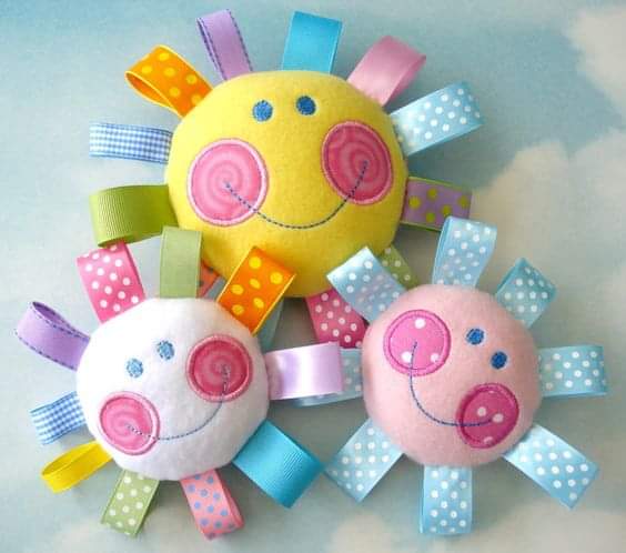 Estos lindos cojines con forma de sol son perfectos para decorar una habitación infantil. Puedes hacerlos del tamaño que quieras y usar además una amplia variedad de telas, como fieltro, manta, algodón, polar o popelina. Los rayos del sol están formados por listones de tela doblados por la mitad. Mira como hacerlos:
